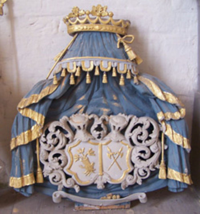 Bild: Bekrönung der Patronatsloge der Kirche in Saal mit den Wappen der Familien aus Hessenburg (Schlichtemühl) v. Gentzkow, ein knospender Baumstamm (links) und v. Ihlfeld mit gekreuzten Hellebarden (rechts).