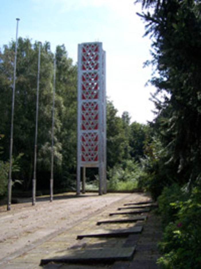 Eine kleine Gedenkstätte wurde bereits im Jahre 1945 eingerichtet. Hier wurden 56 Gefangene bestattet, die bei der Befreiung tot aufgefunden wurden, bzw. kurz danach starben. Nach der Entdeckung eines Massengrabes mit 113 Häftlingen am Barther Galgenberg entstand im Jahre 1963 in der August-Bebel-Str. ein Ehrenmal für die Toten. Am 8. Mai 1966 (dem jährlich begangenen „Tag der Befreiung) wurde in der Nähe des einstigen KZ-Lagers und des Heinkel-Werkes an der Chausseestraße eine Gedenkstätte mit Reliefs des DDR-Bildhauers Jo Jastram (1928-2011) eingeweiht. Es besteht an der Straße aus einer schlichten Betonmauer, im Zentrum der Anlage aus einem aus roten Dreiecken, dem Kennzeichen der KZ-Häftlinge zuammengesetzten Turm, drei vier metallenen Reliefplatten mit künstlerisch verarbeiteten Szenen des Lebens und Sterbens der Häftlinge sowie acht Bodenplatten mit einer mehrsprachigen Inschrift „Hier ruhen 180 von den im KZ für die Profitinteressen des Heinkelkonzerns zu Tode gequälten 2000 Antifaschisten aus 18 europäischen Nationen 1943-1945 ihr Tod ist uns Verpflichtung“. In den Jahren 2000 bis 2003 wurden diese durch sechs Stelen mit Informationen ergänzt.