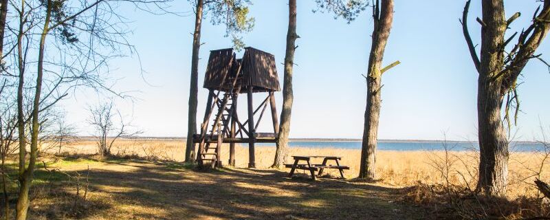 In mitten der Barther Boddenlandschaft habt Ihr einen super Blick über den Bodden und auf die Barther Oie, die den Kranichen und vielen anderen Vögeln als Schlaf- und Brutgebiet dient.